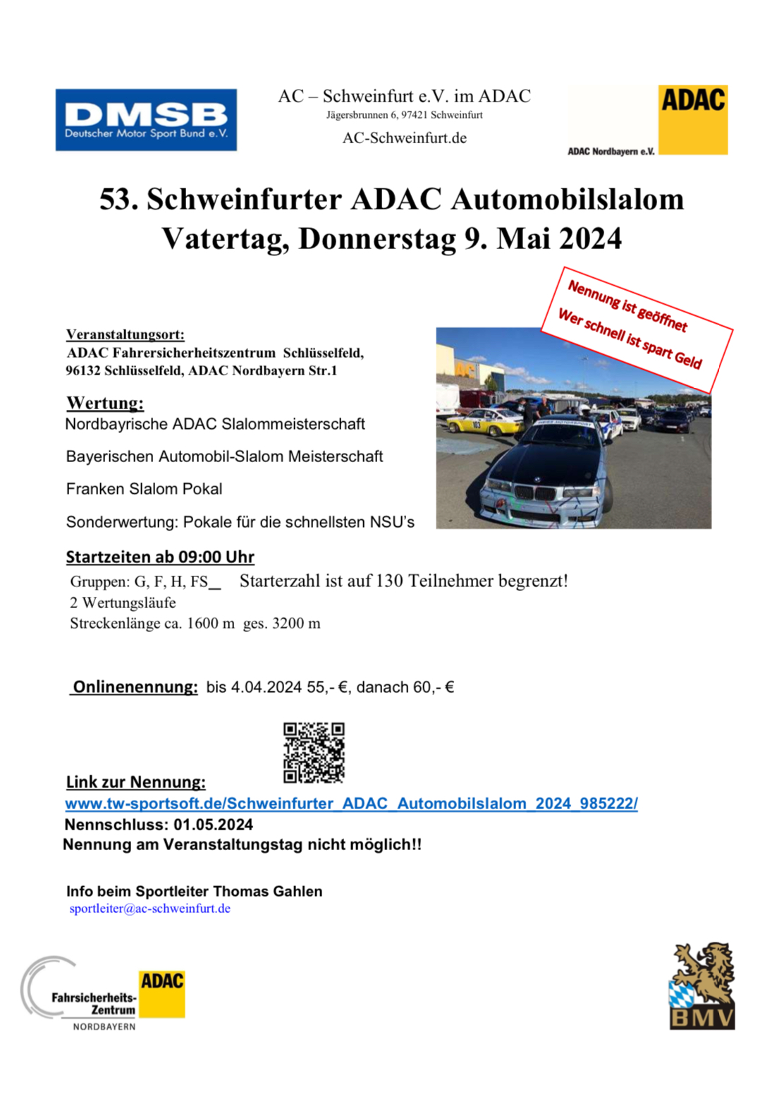 53. Schweinfurter ADAC Automobilslalom am 9. Mai 2024 im ADAC FSZ Schlüsselfeld |